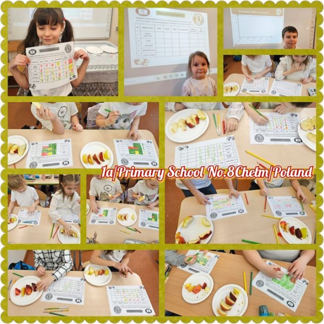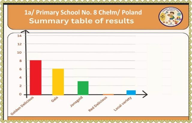 Na zakończenie uczniowie tworzyli tabele porównawcze, wybierali ulubione jabłko oraz opracowywali wykresy słupkowe prezentujące wyniki głosowania. Zwycięzcą okazało się jabłko Golden Delicious, które zdobyło najwięcej głosów. To kolejny inspirujący etap STEAMowej przygody klasy 1a w projekcie eTwinning STEAM Adventure!