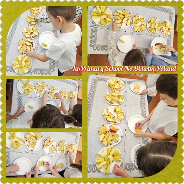 Odbyła się także degustacja jabłek. Uczniowie porównywali różne odmiany, odkrywając, że każda z nich różni się smakiem, kolorem, zapachem i konsystencją. Sprawdzali, które jabłka są najsłodsze, a które najbardziej chrupiące. Była to pyszna i bardzo zdrowa lekcja, podczas której każdy mógł wybrać swojego faworyta i przekonać się, że wszyscy mamy inne preferencje smakowe.
