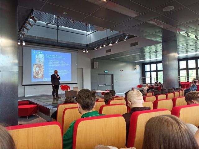 W dniu 17.10.2025 r. uczniowie klasy 7 b wraz z nauczycielem historii p. Agnieszką Szczepanik uczestniczyli w spotkaniu z regionalistą i pasjonatem dziejów ziemi chełmskiej - Zbigniewem Lubaszewskim. Lekcja historyczna odbyła się w Chełmskiej Bibliotece Publicznej im. Marii Pauliny Orsetti i dotyczyła panowania Bolesława Chrobrego oraz znaczenia Grodów Czerwieńskich – kluczowych punktów na średniowiecznej mapie politycznej Polski i Rusi. Młodzież naszej szkoły pogłębiła wiedzę nt. realiów życia wczesnego średniowiecza, polityki władcy, konfliktów pogranicza oraz historycznego znaczenia regionu.