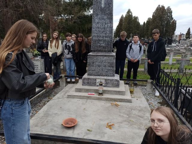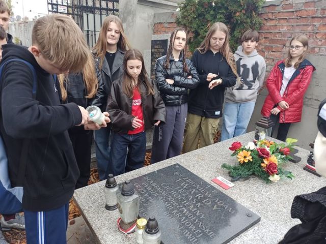 Szanując działania i determinację osób reprezentujących naszą małą ojczyznę, uczniowie klasy 7 b wraz z nauczycielem historii p. Agnieszką Szczepanik 23 października 2025 r. odwiedzili miejsca pamięci narodowej w naszym mieście. Siódmoklasiści uczcili pamięć zapalając znicze na grobach rodaków realizujących cel życia w niezawisłym kraju: dowódcy oddziału Zrzeszenia Wolność i Niezawisłość Henryka Lewczuka „Młota”, cichociemnego porucznika Zbigniewa Twardego, rozstrzelanego przez hitlerowców na Targowicy w Chełmie Damazego Podlewskiego, zamordowanego w Charkowie kapitana Wojska Polskiego Michała Podlewskiego, żołnierzy walczących w wojnie polsko-bolszewickiej, żołnierzy Armii Krajowej, legionisty Stasia Figlera oraz powstańca styczniowego Franciszka Chmielewskiego.