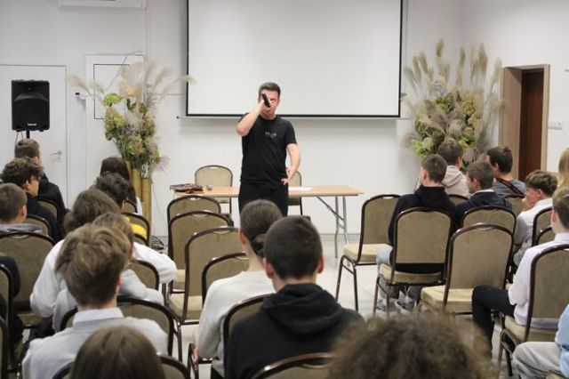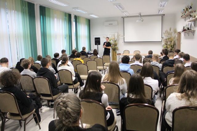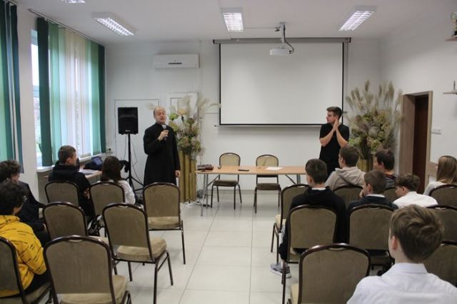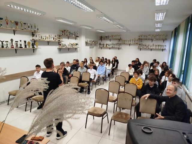 Michał Bukowski na co dzień pracuje w Telewizji Polskiej i jest prowadzącym programy dla młodych: Studio Raban i Agape blisko Ciebie. Kocha muzykę i rap za to, że może wyrażać siebie. Jest liderem hipowego zespołu Muode koty. Dla naszych uczniów była to szansa posłuchać świadectwa człowieka, który kiedy był w ich wieku, przeżywał te same problemy co oni. Mówił, jak dorastał, gdy się buntował rodzicom, miał nałogi i był daleko od Boga. Z tego kryzysu wyprowadził go Jezus Chrystus. Teraz dzieli się swoimi przeżyciami z młodymi. Na koniec ósmoklasiści mogli naszemu Gościowi zadawać pytania dotyczące wiary czy muzyki.