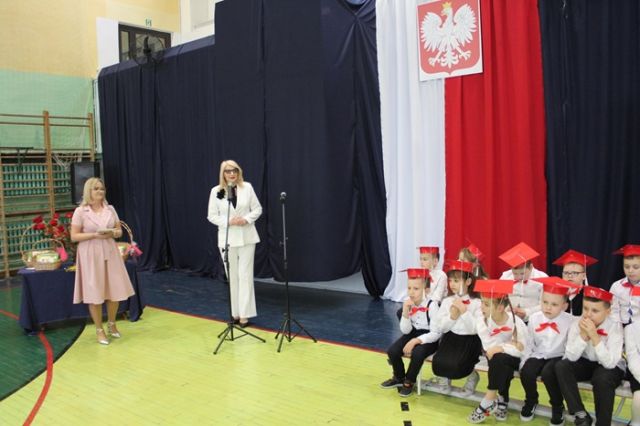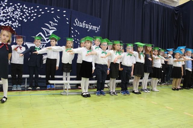 Uczniowie zaprezentowali część artystyczną, po której złożyli ślubowanie na sztandar szkoły. Następnie Pani Dyrektor Beata Tomaszczuk wraz z Panią Wicedyrektor Anną Chochół dokonały aktu pasowania na ucznia.