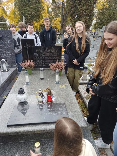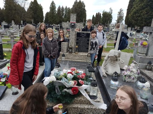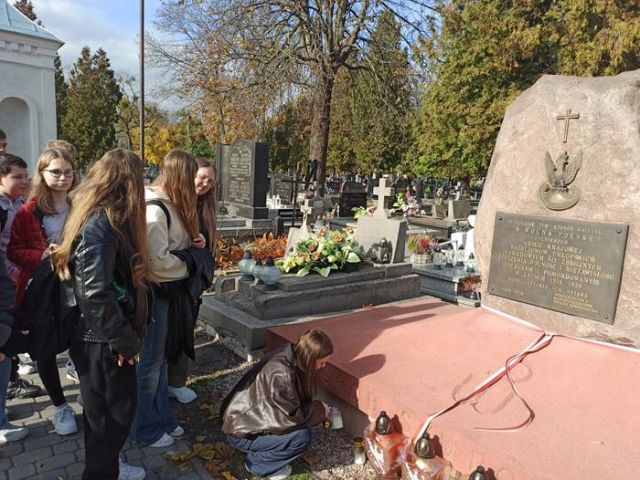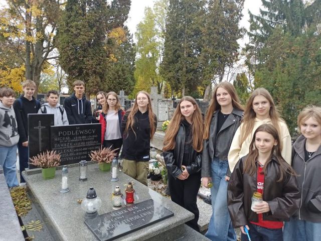 Szanując działania i determinację osób reprezentujących naszą małą ojczyznę, uczniowie klasy 7 b wraz z nauczycielem historii p. Agnieszką Szczepanik 23 października 2025 r. odwiedzili miejsca pamięci narodowej w naszym mieście. Siódmoklasiści uczcili pamięć zapalając znicze na grobach rodaków realizujących cel życia w niezawisłym kraju: dowódcy oddziału Zrzeszenia Wolność i Niezawisłość Henryka Lewczuka „Młota”, cichociemnego porucznika Zbigniewa Twardego, rozstrzelanego przez hitlerowców na Targowicy w Chełmie Damazego Podlewskiego, zamordowanego w Charkowie kapitana Wojska Polskiego Michała Podlewskiego, żołnierzy walczących w wojnie polsko-bolszewickiej, żołnierzy Armii Krajowej, legionisty Stasia Figlera oraz powstańca styczniowego Franciszka Chmielewskiego.