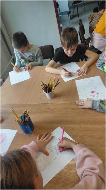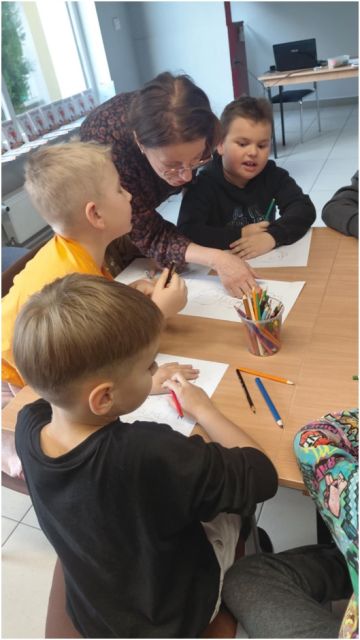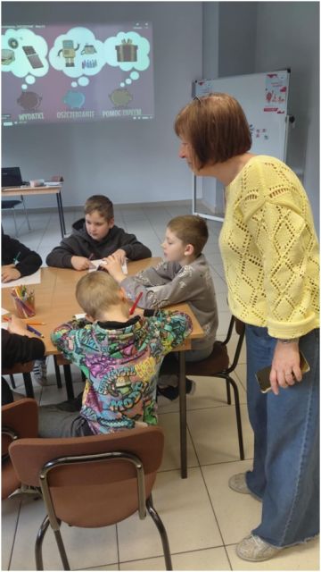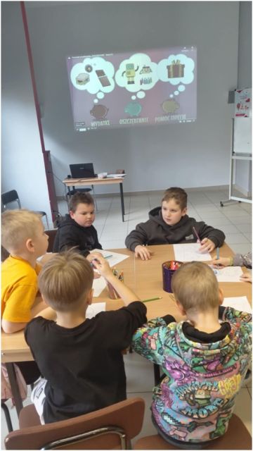 -na zakończenie wykonali pracę plastyczną, kolorując trzy skarbonki i dorysowując elementy symbolizujące wydatki, oszczędzanie i prezent.