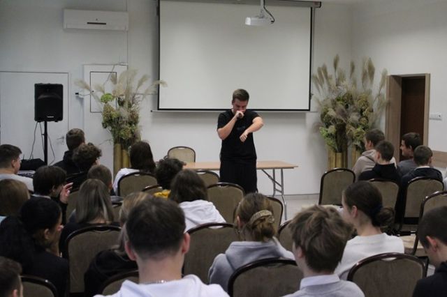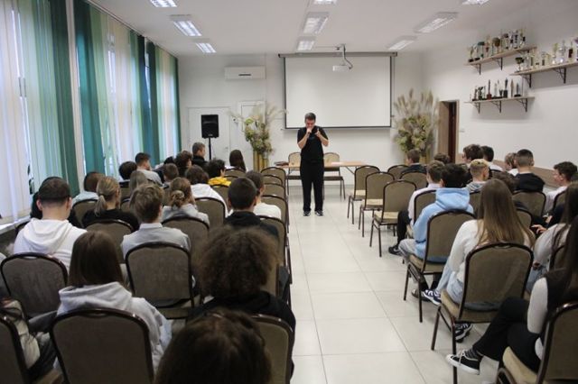 Michał Bukowski na co dzień pracuje w Telewizji Polskiej i jest prowadzącym programy dla młodych: Studio Raban i Agape blisko Ciebie. Kocha muzykę i rap za to, że może wyrażać siebie. Jest liderem hipowego zespołu Muode koty. Dla naszych uczniów była to szansa posłuchać świadectwa człowieka, który kiedy był w ich wieku, przeżywał te same problemy co oni. Mówił, jak dorastał, gdy się buntował rodzicom, miał nałogi i był daleko od Boga. Z tego kryzysu wyprowadził go Jezus Chrystus. Teraz dzieli się swoimi przeżyciami z młodymi. Na koniec ósmoklasiści mogli naszemu Gościowi zadawać pytania dotyczące wiary czy muzyki.