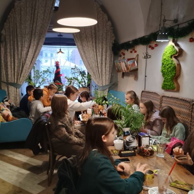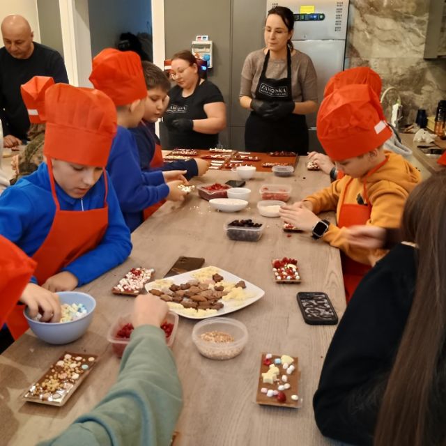 Kolejnym etapem wycieczki była wizyta w Zamojskiej Manufakturze Czekolady. Uczniowie brali udział w warsztatach, podczas których wykonywali i ozdabiali własne czekolady, lizaki oraz czekoladowe kule. Każdy uczestnik otrzymał certyfikat potwierdzający udział w zajęciach oraz własnoręczne przygotowane czekoladowe smakołyki. Dopełnieniem zajęć był miło spędzony czas na popijaniu gorącej czekolady i rozgrywki w gry planszowe.