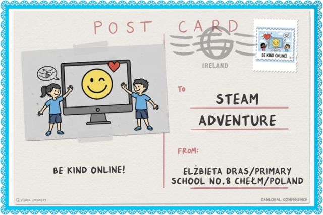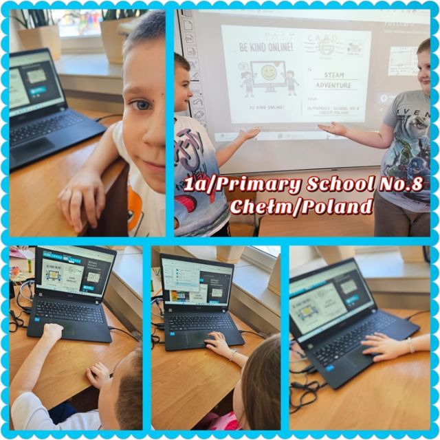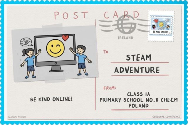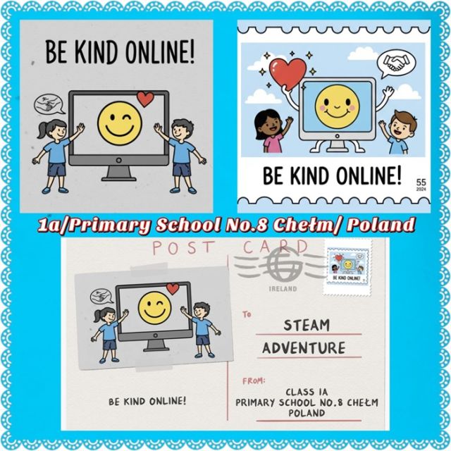 💻 Dzień Bezpiecznego Internetu: Świętowali kreatywnie! Uczniowie zaprojektowali wirtualną pocztówkę z ważnym hasłem („Bądź miły w sieci”). Przy okazji ćwiczyli umiejętności cyfrowe i adresowanie po angielsku: Primary School No. 8 Chełm / Poland.