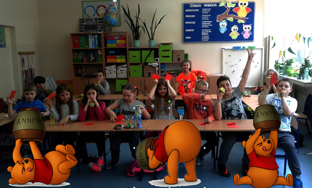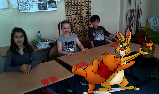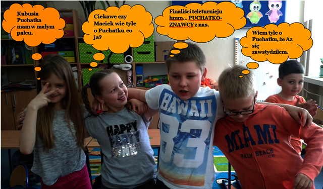 W dniu dzisiejszym w klasie II a p. Berenika Błazucka zorganizowała teleturniej 1 z 23, w którym dzieci zmierzyły się z pytaniami dotyczącymi książki A.A. Milne "Kubuś Puchatek". Zasady klasowego teleturnieju były bardzo podobne do tych z programu 1 z 10. Dzieci otrzymały 2 szanse, których zachowanie gwarantowało przejście do półfinału a w dalszej kolejności do ścisłego finału. "Walka" była wyrównana a pytania tj.: Jakie słowo zamiast "zasadzka" usłyszał Puchatek podczas wyprawy z Krzysiem? Co chciał podać Kłapouch Maleństwu gdy to było w wodzie? Jakiego koloru był balonik na którym Puchatek wzleciał by zabrać pszczołom miodek? Co według Prosiaczka lubią słonie? nie sprawiły dzieciom najmniejszych trudności.