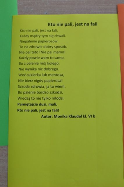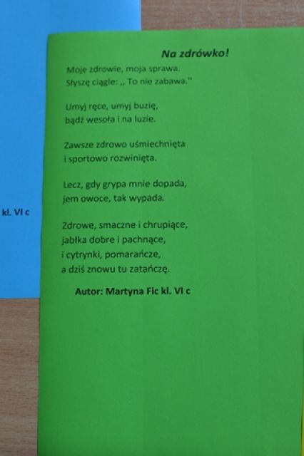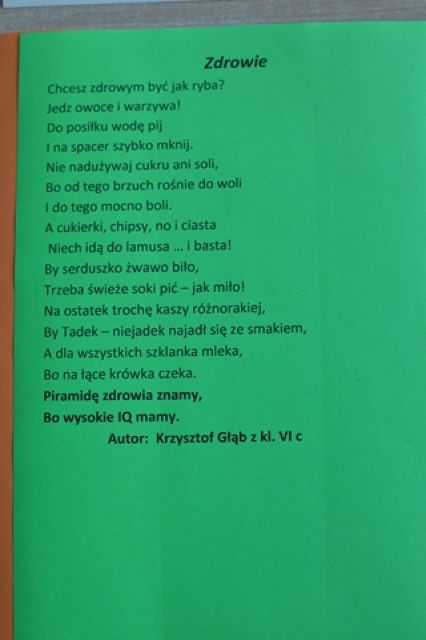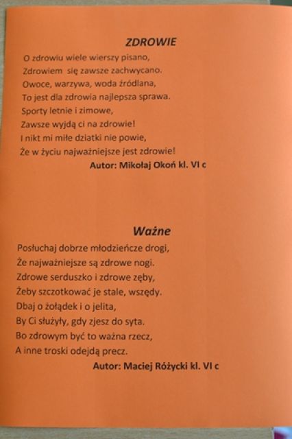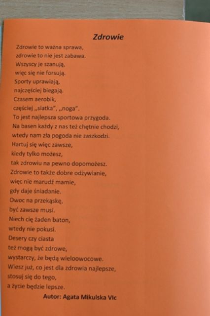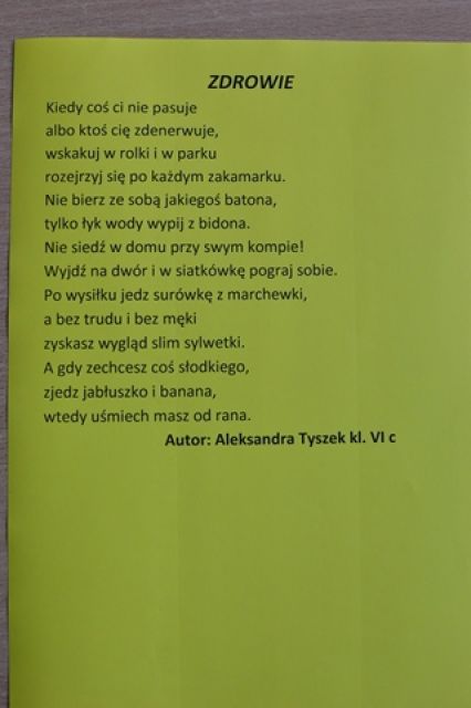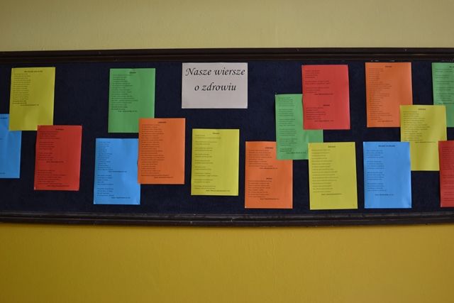 W ramach promowania zdrowego stylu życia w naszej szkole zorganizowany został konkurs poetycki na wiersz o zdrowiu. Jego celem było kształtowanie postaw prozdrowotnych, doskonalenie umiejętności językowych, rozwijanie uzdolnień literackich dzieci i młodzieży, poszukiwanie nowych talentów.