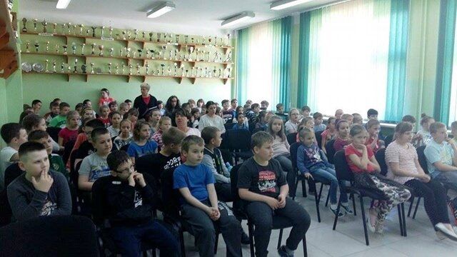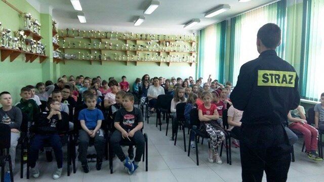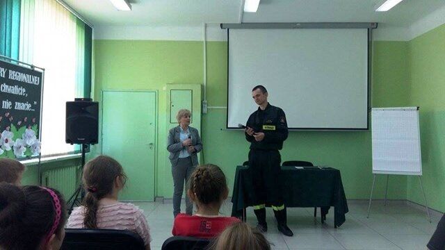 W naszej szkole 19 maja 2016 r. odbyło się spotkanie uczniów klas I-IV ze strażakiem z Państwowej Straży Pożarnej w Chełmie. W trakcie spotkania mł. kpt. Pan Radosław Gajuk przybliżył dzieciom, na czym polega praca strażaka i przekazał cenne wskazówki, jak bezpiecznie zachować się w czasie burzy, wypadku, czy pożaru. Dzieci utrwaliły numery alarmowe 998 i 112 i dowiedziały się, w jakich okolicznościach należy wezwać straż pożarną. Okazało się, że praca strażaków nie ogranicza się wyłącznie do gaszenia pożarów. Straż pożarna pomaga ludziom podczas wypadków samochodowych i powodzi oraz prowadzi wiele innych działań, które służą ludziom i ich bezpieczeństwu. Interwencje te są bardzo niebezpieczne i wymagają niecodziennej odwagi. Strażak powiedział również o tym, jak bardzo ogień niszczy przyrodę. Wyjaśnił uczniom, jakie zagrożenia wiążą się z wypalaniem traw. Ogień wyrządza wiele szkód w środowisku, w ogniu ginie wiele roślin łąkowych, często chronionych oraz zwierząt. Poza tym wystarczy mały podmuch wiatru, aby ogień rozprzestrzenił się i pochłonął wszystko, co spotka na swojej drodze. Dzięki spotkaniu z funkcjonariuszem straży pożarnej uczniowie utrwalili sobie wiadomości na temat bezpiecznych zachowań i zapobiegania sytuacjom zagrażającym zdrowiu lub życiu.